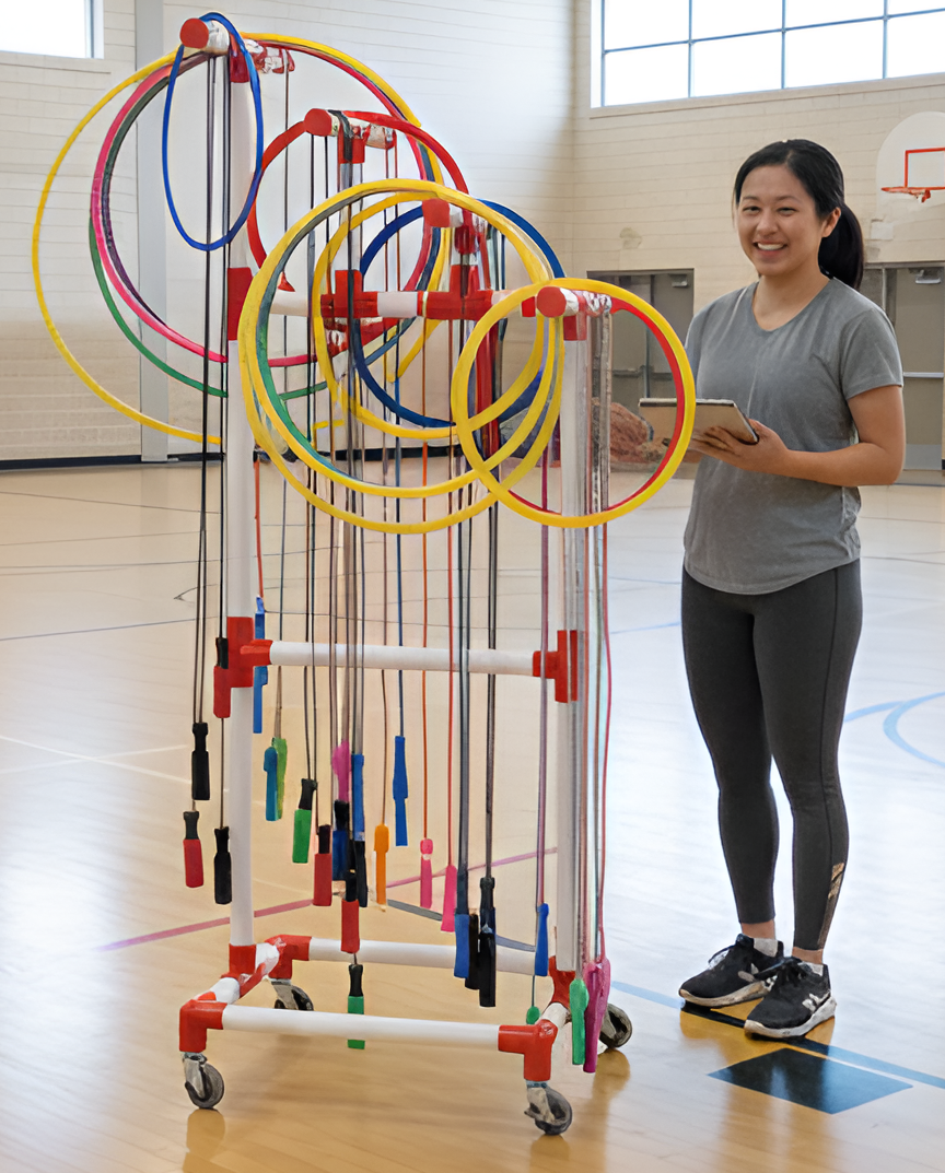 Easy access to jump ropes of all sizes. A sturdy, multi-level cart that conveniently stores and safely transports jump ropes of all sizes. The eight large bars on four ascending levels allow rope jumpers of all ages to easily locate and access the correct size jump rope. Makes jump rope distribution quick and easy.